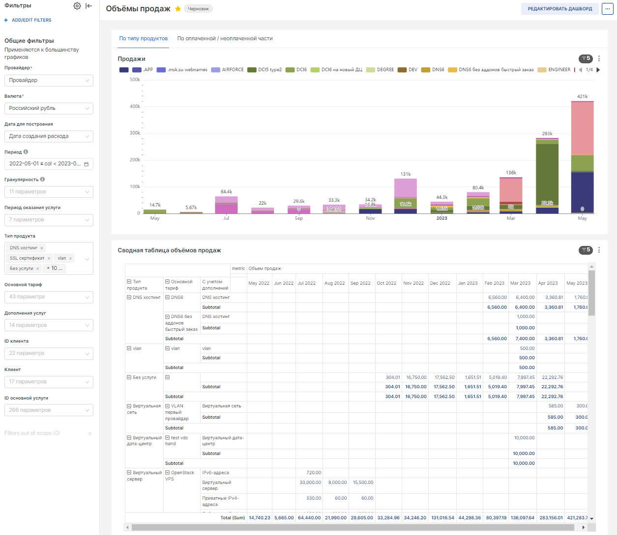 Позволяет оценить долю по типу продукта или по периоду оказания услуг на текущий месяц в значениях показателей, отражённых выше (MRR, расходы, активные услуги).
