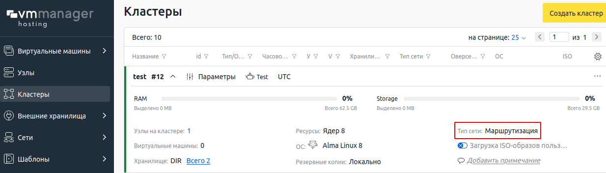 - Определите тип настройки сети в кластере. Для этого перейдите в раздел Кластеры → выберите кластер → поле Тип сети.