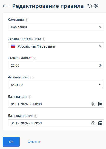 Чтобы создать новое правило, перейдите в раздел Провайдер → Провайдеры → выберите провайдера → кнопка Налоги → кнопка Создать.