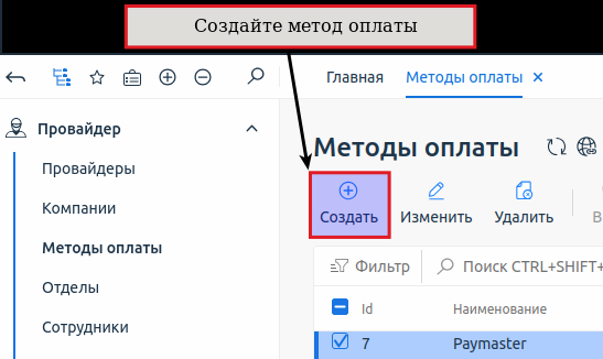 Чтобы подключить методы оплаты, перейдите в раздел Провайдер → Методы оплаты → кнопка Создать: