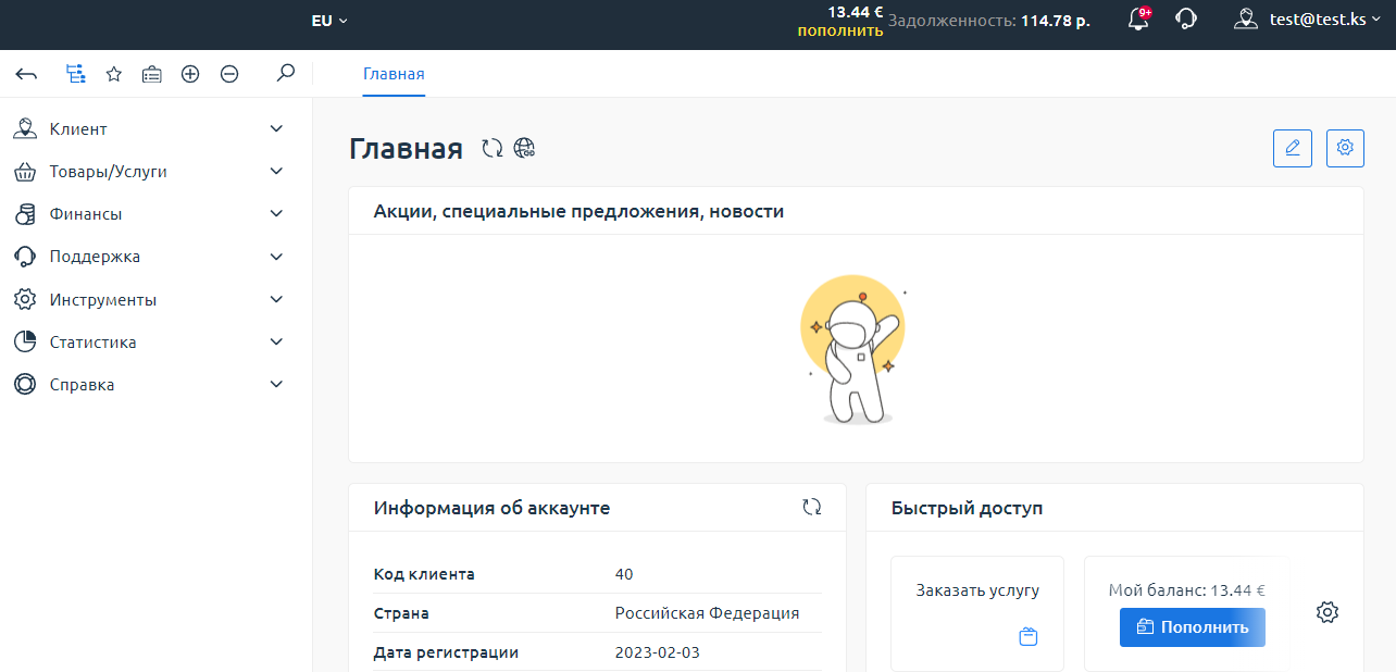 На главной странице расположена информация об аккаунте, текущих операциях и услугах, список запросов в техническую поддержку, панель быстрого доступа.