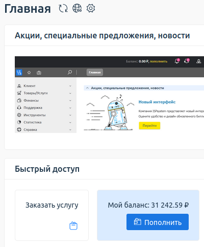 - Перейдите на Главную страницу личного кабинета и нажмите кнопку Пополнить баланс.