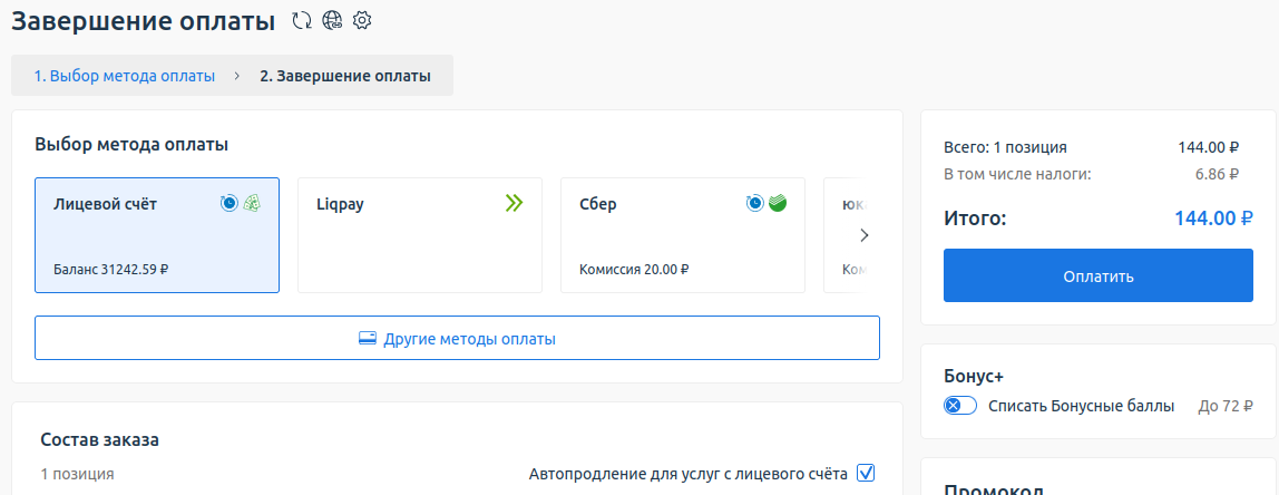 - оплата услуги выбранным методом оплаты — вы оплачиваете услугу напрямую каким-либо методом оплаты, не задействуя при этом лицевой счёт. Например, банковской картой или переводом. Также вы можете сохранить данные банковской карты или электронного кошелька в Способах оплаты. Далее эту карту или кошелёк можно использовать для оплаты услуг и оформления подписок на услуги. Подробнее об этом см. Способы оплаты.