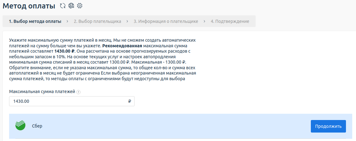 - В форме настройки выберите метод оплаты и максимальную сумму, на которую можно пополнить баланс за месяц. Нажмите Продолжить.