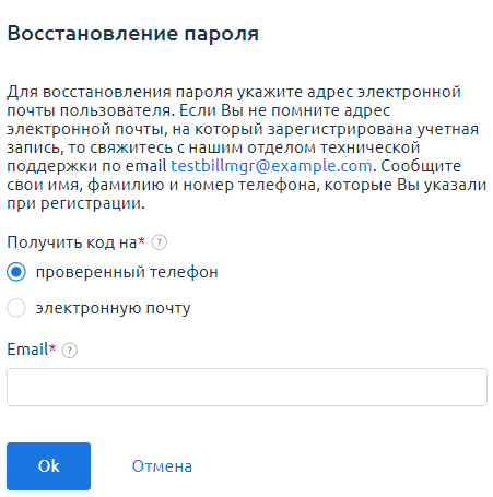 По умолчанию BILLmanager отправляет код для восстановления на email пользователя. Чтобы BILLmanager мог отправлять письма, настройте сервер исходящих сообщений.