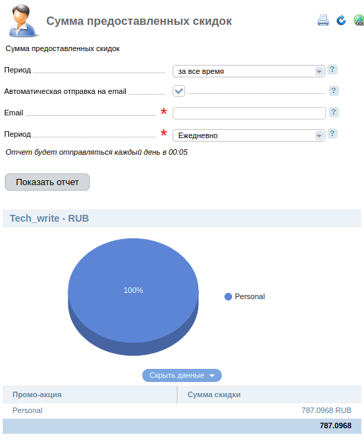 Отчёт содержит сумму предоставленных скидок за выбранный период.