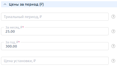 Раздел включает в себя настройки стоимости дополнительного ресурса. После заполнения поля "За месяц", валидатор автоматически рассчитает стоимость дополнения за оставшиеся периоды. Цены назначенные валидатором можно изменить. Стоимость указывается в валюте провайдера, для которого создан тарифный план.