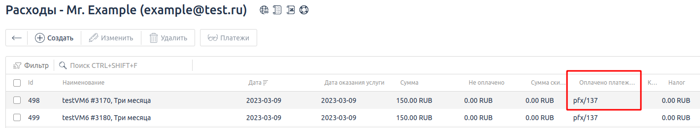 - Перейдите в раздел Клиенты → выберите клиента → кнопка Расходы. В графе Оплачено платежами будет указан номер платежа, если расход оплачен.