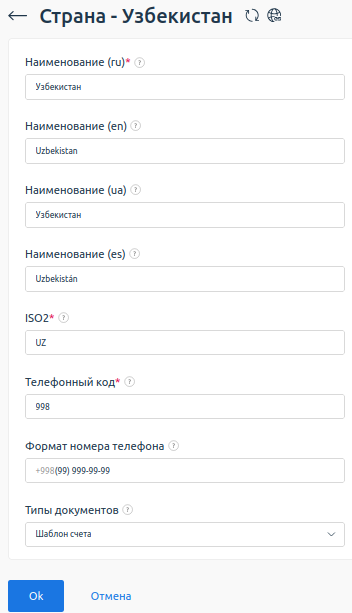 - Перейдите в раздел Справочники → Страны → выберите страну → Изменить.