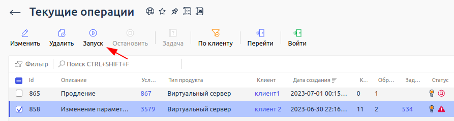 Если операция исчезнет из списка, значит обработка услуги завершилась успешно. Если после перезапуска в статусе операции появился значок