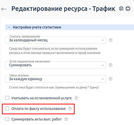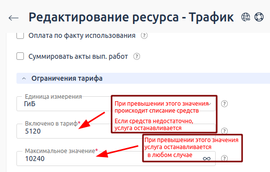 - значения Включено в тариф — количества ресурса, включённого в стоимость тарифа. При превышении этого значения с клиента будут списываться средства за каждую единицу ресурса, использованного сверх установленного лимита. Если средств недостаточно, происходит остановка услуги.