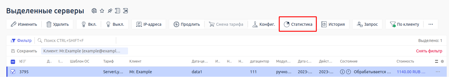 - Проверьте статистику по ID услуги. Для этого перейдите в раздел Товары/услуги → выберите услугу → кнопка Статистика в верхнем меню: