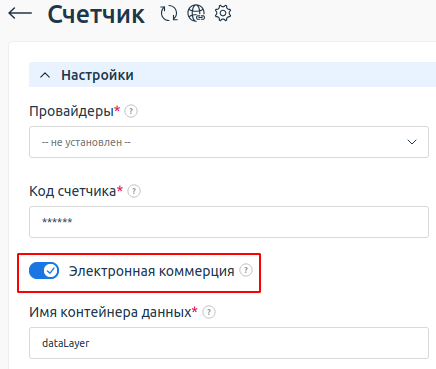 В настройках счётчика включите опцию Электронная коммерция. В код счётчика добавится контейнер для сбора данных dataLayer.