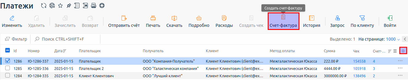 Чтобы создать счёт-фактуру, перейдите в раздел Финансы → Платежи → выберите платёж → Счёт-фактура → нажмите Ок.