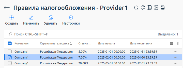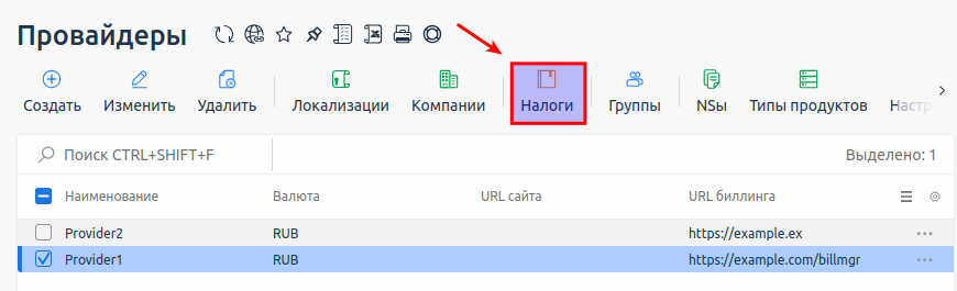 Чтобы вручную изменить настройку правил налогообложения, в левом меню перейдите в раздел Провайдер → Провайдеры → выберите провайдера → кнопка Налоги → выберите правило → кнопка Изменить. Подробнее о настройке правил налогообложения см. в статье Налоги.