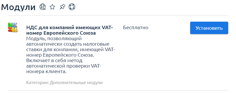 Чтобы установить модуль, перейдите в раздел Интеграция → Модули → НДС для компаний имеющих VAT-номер Европейского Союза → кнопка Установить.