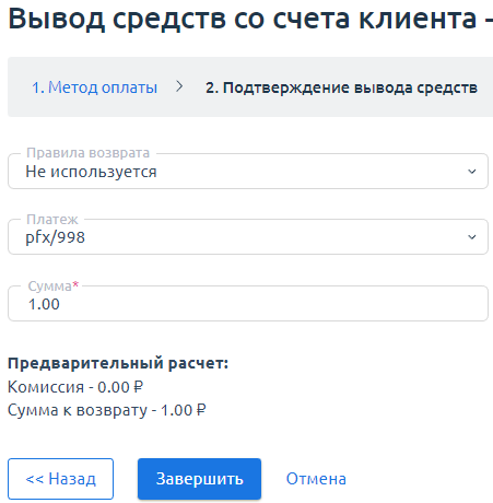 Вывод средств со счёта клиента доступен только через банковский перевод или настраиваемый метод оплаты.