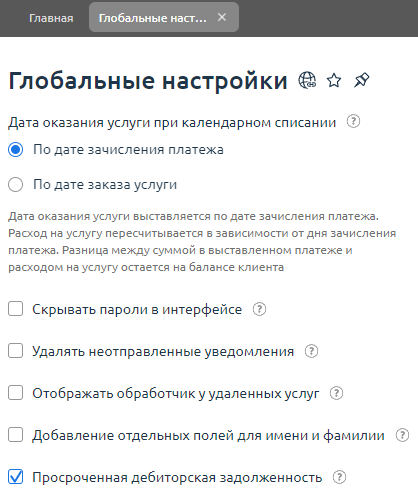 - Перейдите в раздел Провайдер → Глобальные настройки → активируйте опцию Просроченная дебиторская задолженность.