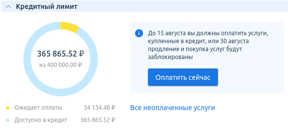 Кредитный лимит — резерв средств, который позволяет заказывать услуги в долг в течение месяца. Сумма долга не может превышать лимит и должна быть погашена в установленные провайдером сроки.