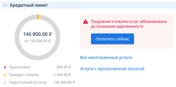 На дашборде появляется сообщение: "Продление и покупка услуг заблокированы до погашения задолженности".