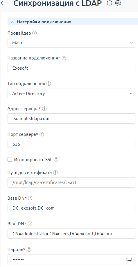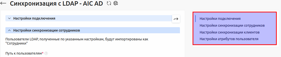 Чтобы настроить синхронизацию с LDAP, перейдите в раздел Интеграция → Синхронизация с LDAP: