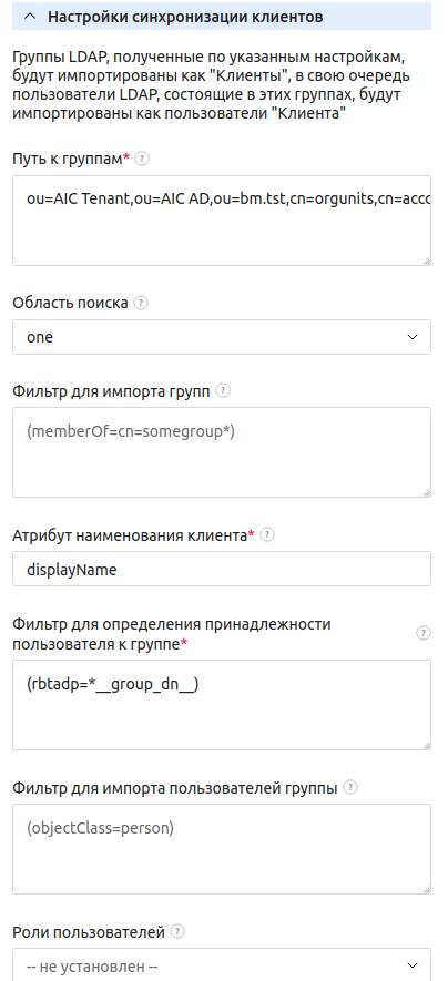 Группы LDAP, полученные по указанным настройкам, будут импортированы как "Клиенты". Пользователи LDAP, которые состоят в этих группах, будут импортированы как пользователи "Клиента".