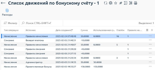 Администратор платформы может просматривать общий список движений по бонусным счетам в разделе Финансы → Операции с бонусами. В этом разделе можно применить фильтр по нужному клиенту и посмотреть движения по нескольким бонусным счетам одного клиента.