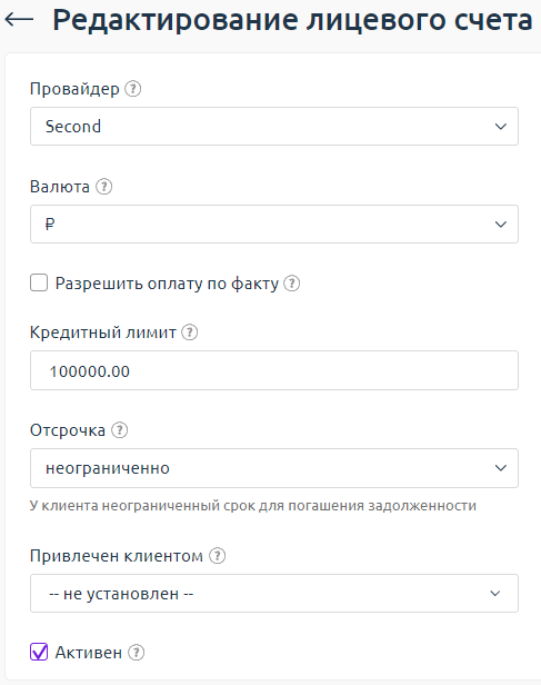 - Разрешить оплату по факту — включите опцию, чтобы клиент оплачивал услуги по факту их использования. При выключенной опции будут доступны настройки кредитного лимита.
