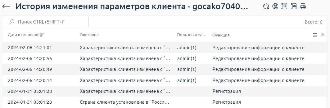 Чтобы увидеть историю изменений карточки клиента, перейдите в раздел Клиенты → Клиенты → выберите клиента → кнопка История.