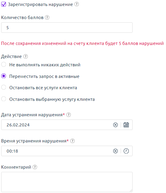 - Зарегистрировать нарушение — активируйте опцию, чтобы показать параметры для регистрации нарушения: