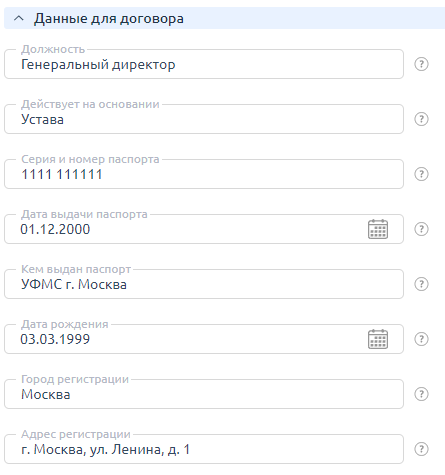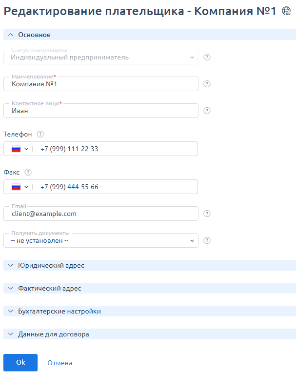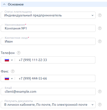Заполните информацию о плательщике. Каждый тип плательщика требует определённые данные, заполните все поля. В дальнейшем при формировании счёта все реквизиты будут подставляться автоматически.