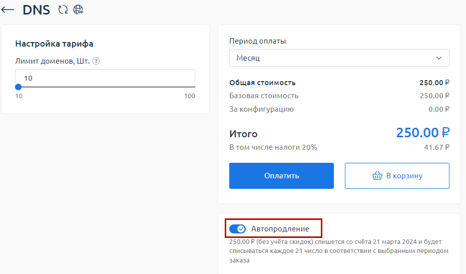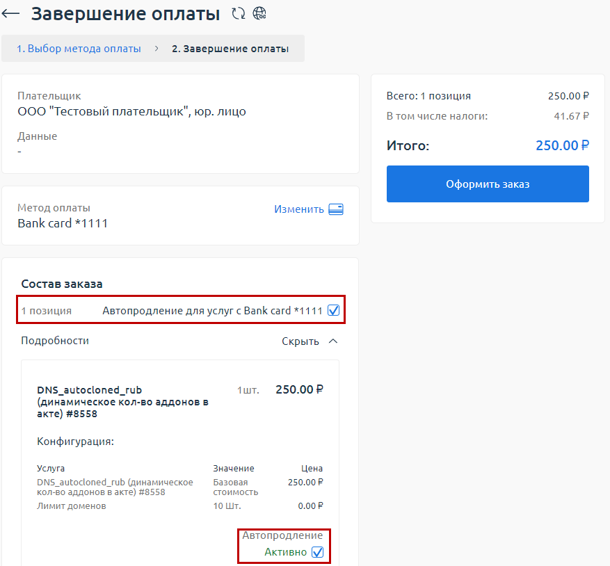 Опция автопродления доступна как на форме оплаты, так и в корзине. На форме оплаты автопродление по умолчанию включено. Вы можете отказаться от него: