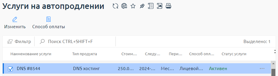 Чтобы посмотреть у каких услуг включено автопродление, перейдите в раздел Финансы → Автопродление услуг. В открывшемся списке будут отображены услуги с автопродлением.
