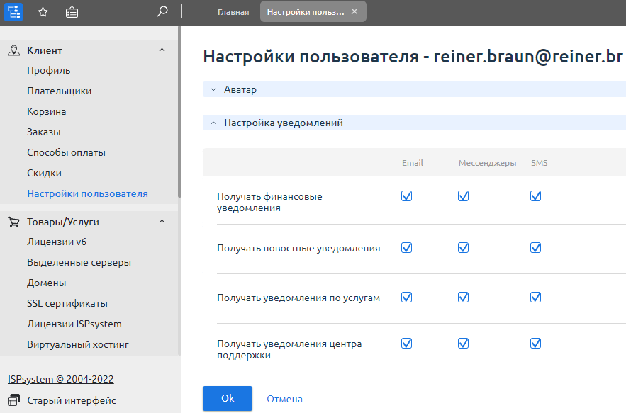 В разделе Клиенты → Настройки пользователя → блок Настройка уведомлений вы можете выбрать несколько каналов и нужные типы уведомлений. В зависимости от настроек вашего провайдера может быть доступна отправка уведомлений: