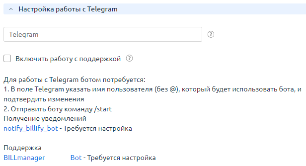 - Напишите боту, которого создал ваш провайдер, сообщение /start. Чтобы узнать название бота, наведите на подсказку рядом с полем Telegram.