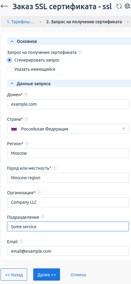 При заказе услуги укажите Параметры SSL-сертификата. Настройка выполняется в несколько шагов: