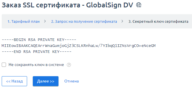 Сохраните секретный ключ сертификата.