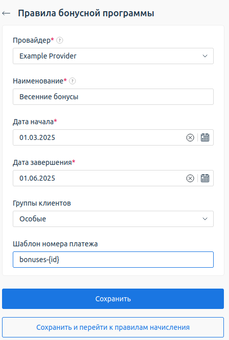Пример - Нажмите Сохранить и перейти к правилам начисления, если хотите продолжить настройку, или Сохранить, если планируете вернуться к настройками позже.