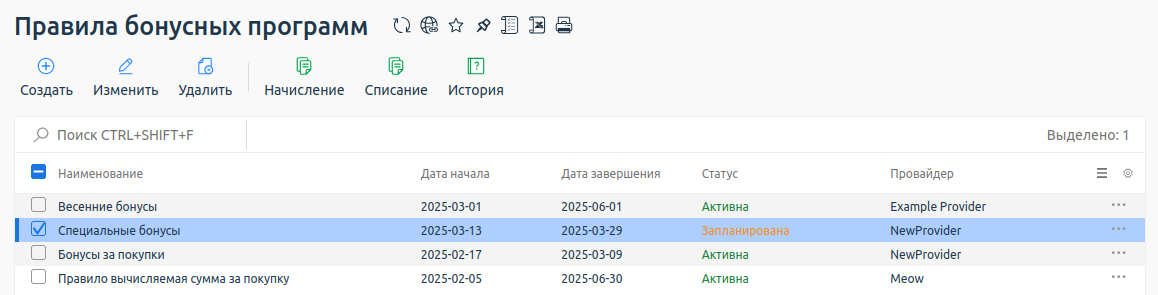 - Изменить — выберите существующее правило начисления, которое необходимо изменить;