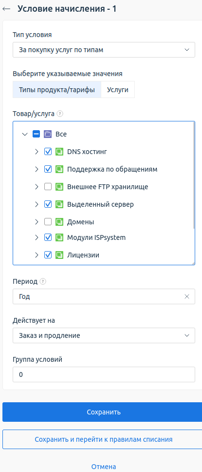- За покупку услуг по типам — бонусы начисляются при покупке или продлении услуг с ненулевой стоимостью по указанным тарифам с указанным периодом. За бесплатные услуги бонусы не начисляются. Выберите: