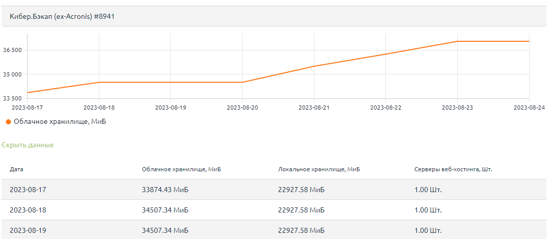 Чтобы посмотреть отчёт по статистике использования, перейдите в раздел Товары/Услуги → Резервное копирование → выберите услугу → кнопка Статистика.