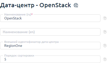 Перед настройкой обработчика измените существующий дата-центр, либо создайте новый, указав внешний идентификатор. Для этого перейдите в Интеграция → Дата-центры → кнопка Создать или Изменить → в поле Внешний идентификатор дата-центра укажите наименование региона развёртывания OpenStack. Например, RegionOne.