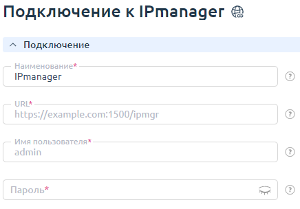 - Имя пользователя — аккаунт в IPmanager с правами доступа "Пользователь". От имени этого пользователя Clouden будет обращаться к IPmanager и получать / возвращать IP-адреса.