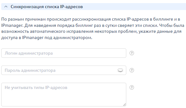 Для синхронизации IP-адресов не рекомендуется указывать данные администратора IPmanager. Особенно, если в IPmanager существуют IP-адреса, занятые вручную (не Clouden'ом) и в биллинговой платформе эти адреса не привязаны к услугам.