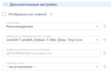 Шаблоны операционных систем — операционные системы, доступные в рамках тарифа. Укажите возможные значения в разделе Продукты → Типы продуктов → Параметры → Значения → Тарифы.