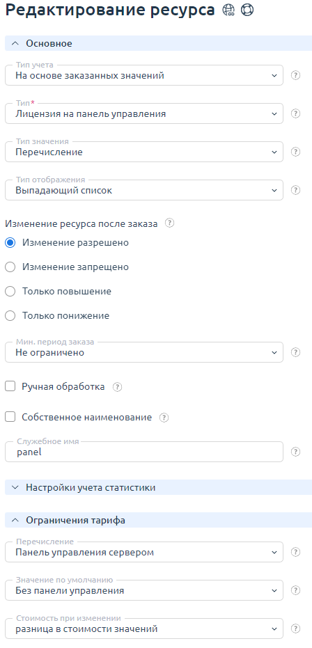Настройка ресурса "Лицензия на панель управления"