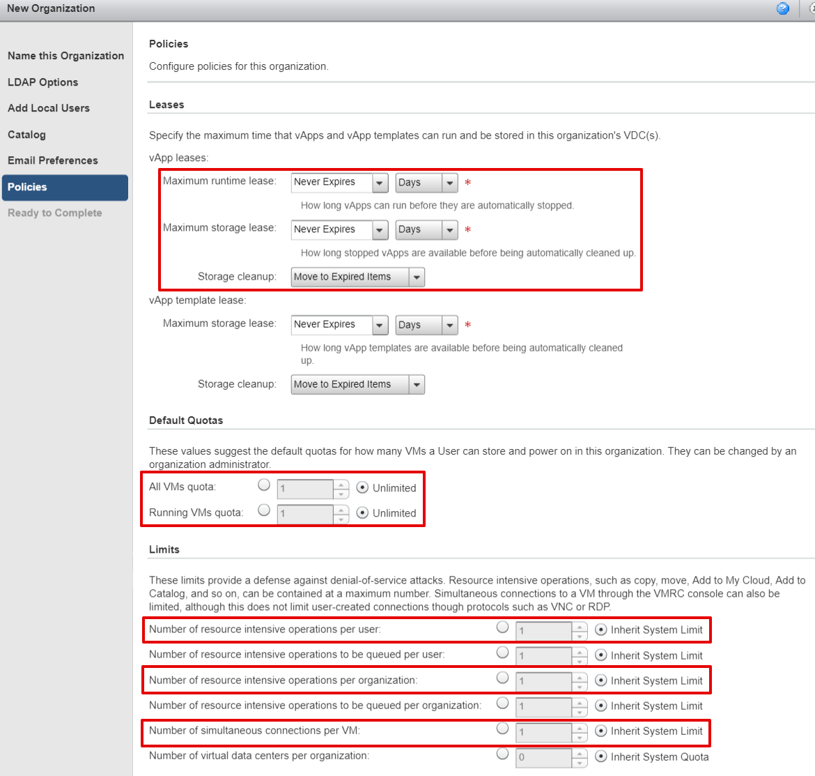 В VMware Cloud Director создайте организацию, в на этапе Policies укажите настройки политик: