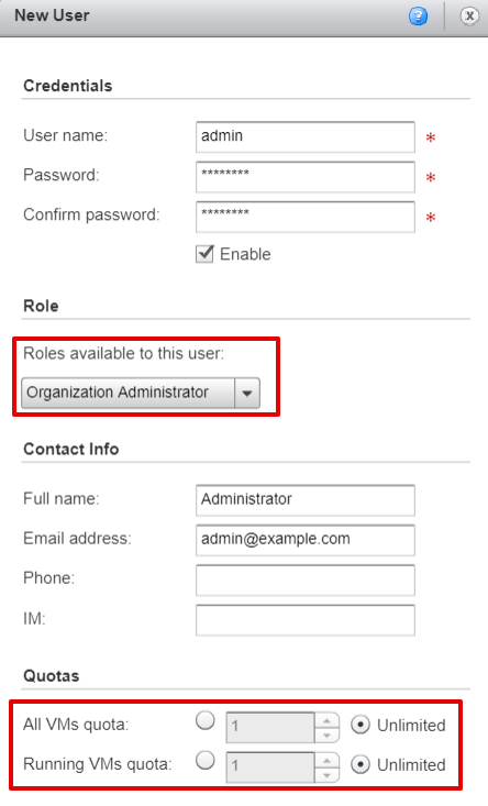 В созданную организацию добавьте учётную запись пользователя с ролью Organization Administrator и безлимитными квотами на виртуальные машины: вкладка Administration → Members → Users → кнопка New user: