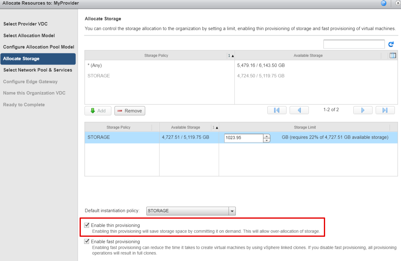 - Этап "Allocate Storage". Включите опцию "Enable thin provisioning":