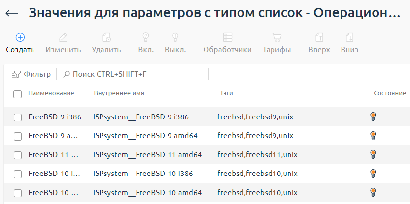 Подключить полученные шаблоны ОС к тарифу можно при его настройке или в разделе Продукты → Типы продуктов → выделить Виртуальный сервер → кнопка Параметры → выберите Операционная система → кнопка Значения. Внутреннее имя загруженных шаблонов начинается с "vappTemplate":